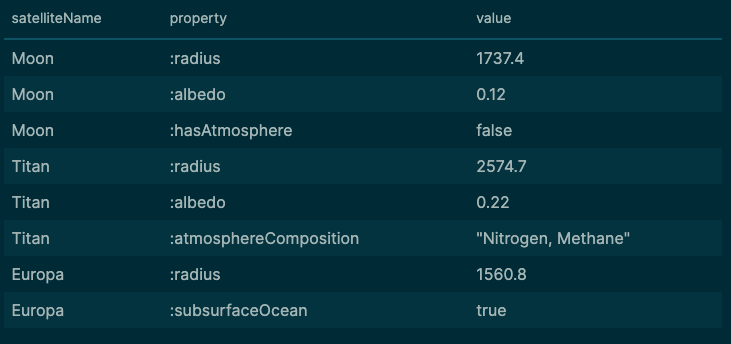 Let’s find all bodies in Jupiter’s orbital system (recursive), enrich with Wikipedia data (federated), and show me whatever properties they have (schema-flexible).