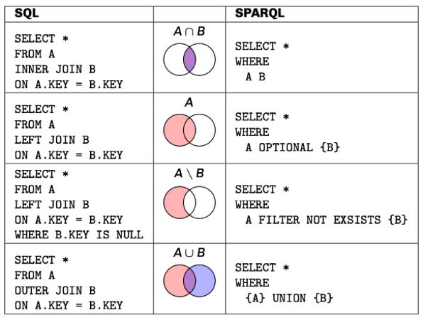💡 Key takeaways: SPARQL does not need explicit JOINs because relationships are built into the data model. When variables appears in multiple patterns they act as implicit connection points.